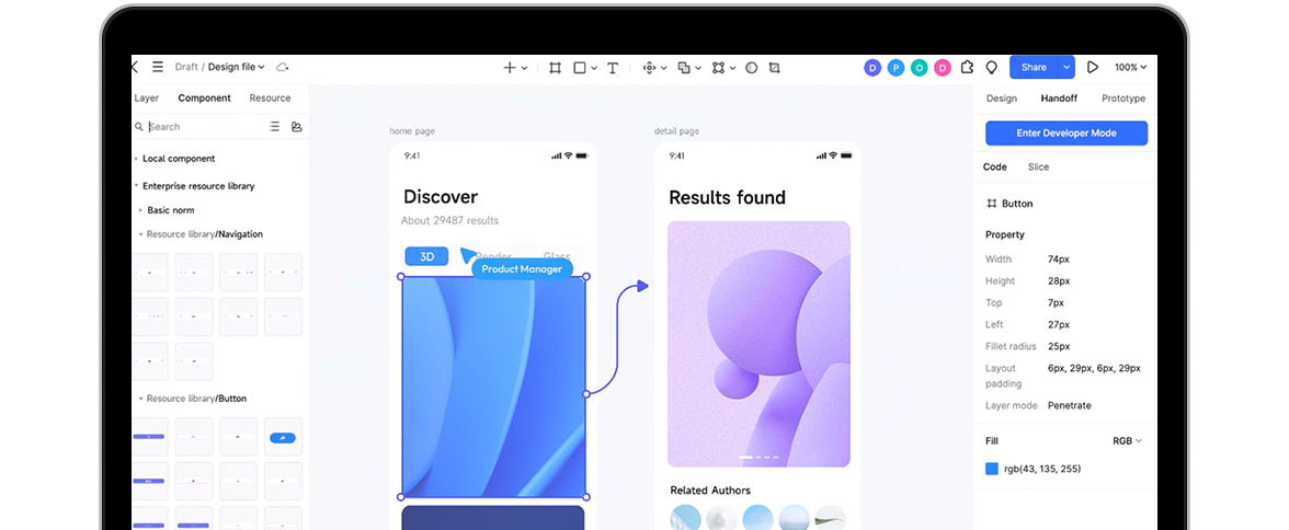 Идеально подходит для совместной работы над макетами, прототипами и дизайн-системами.